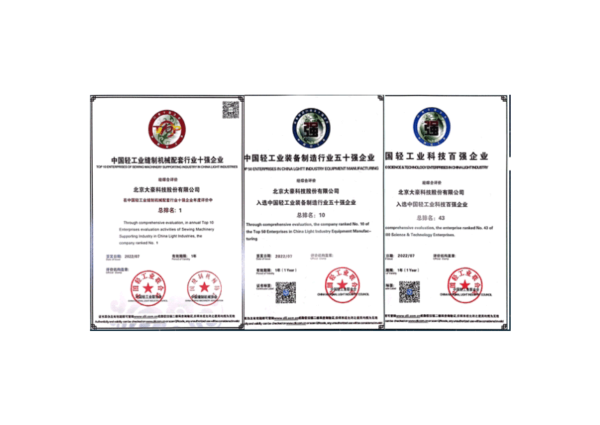 • 大豪科技荣获“中国缝制设备行业十强企业”(第1名),“中国轻工业装备制造行业五十强企业”(第10名),“”中国轻工业科技百强企业”(第43名)