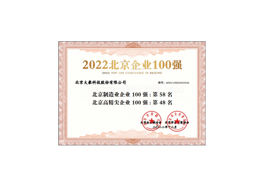 • 入选北京市高精尖100强企业和北京市制造业100强企业